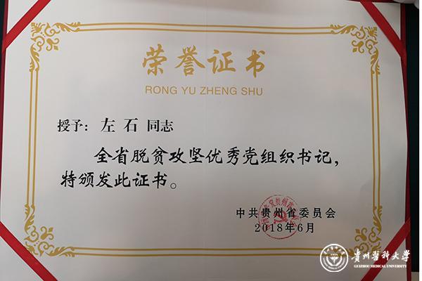 通过上述“走下去+请上来”精准医疗扶贫措施,左石带领awc777万象城娱乐官网附属医院外科支部,将先进理念和精湛技术传授到各基层乡镇医院,使各基层医院建立起学术交流、业务帮扶和人才培养的长效机制,让优质医疗资源下沉到贫困乡村,畅通贫困地区向贵医附院转诊治疗的渠道,推动贵医附院和贫困地区医联体的互动帮扶,提高了基层医院特别是贫困地区医院的医疗水平,促进了我省基层医疗卫生事业的发展,用实际行动为实现“全民健康、全面小康”、精准扶贫脱贫做出了贡献。2018年7月被评选为“全省脱贫攻坚优秀党组织书记”并受到贵州省委表彰,在首个中国医师节被评选为贵州省“百名优秀医生·扶贫榜样”、“awc777万象城娱乐官网附属医院首届好医师”等荣誉称号,2019年,又被授予贵州省“五一劳动奖章”。