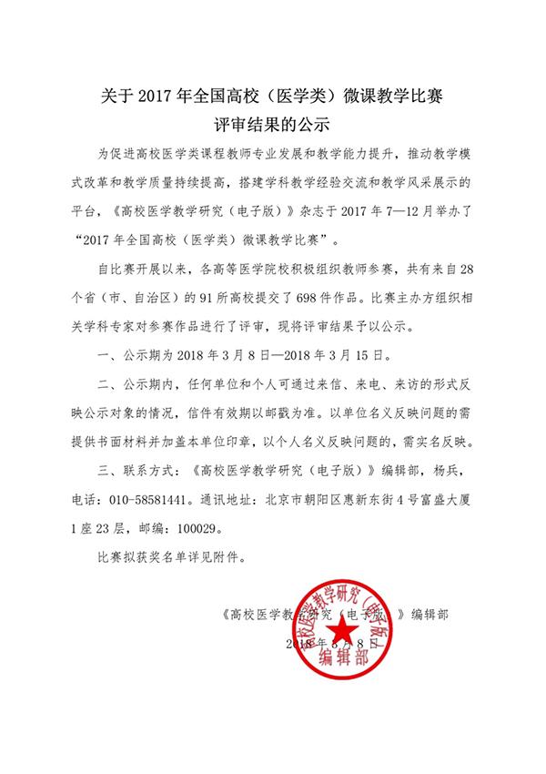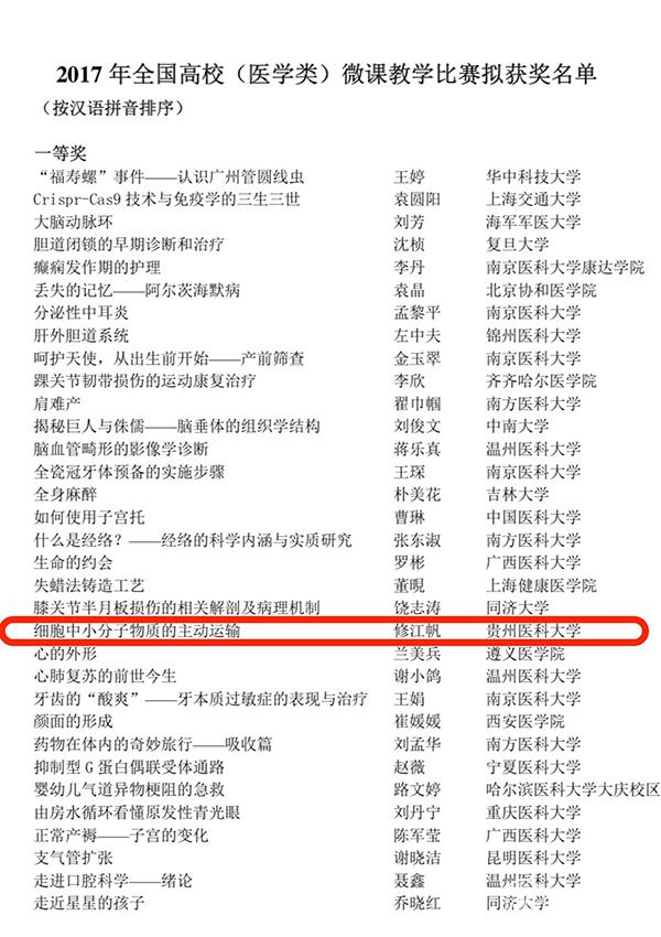近日,2017年第四届全国高校(医学类)微课教学比赛公布结果,万象城官网获得一等奖1项、三等奖1项、鼓励奖2项、教学风采奖1项,同时学校获得优秀组织奖。
