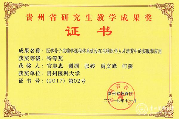 近日,贵州省教育厅颁发了第二届贵州省研究生教学成果奖证书,万象城官网分子生物学重点实验室官志忠教授主持的“医学分子生物课程体系建设在生物医学人才培养中的实践和应用”荣获特等奖,成果获奖人有:官志忠、谢渊、张婷、禹文峰、何燕。