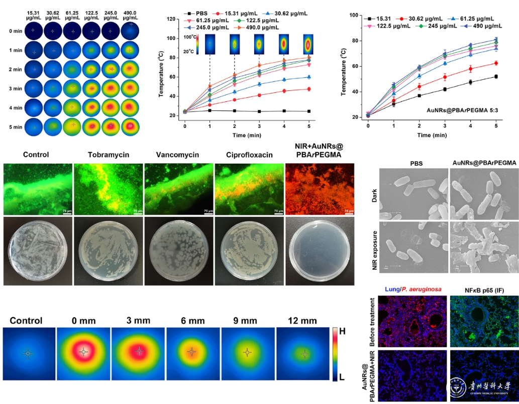 团队利用多功能分子苯硼酸材料构建聚合物,并修饰到金纳米棒的表面,得到对耐药铜绿假单胞菌具有粘附聚集作用的纳米复合材料。当使用细菌感染细胞时,由于苯硼酸材料对细菌的粘附作用,能够降低细菌对细胞的伤害作用,减轻细胞的炎症反应,提高细胞存活率。该纳米复合材料的近红外光热杀菌作用,能够短时间内杀死小鼠肺部耐药铜绿假单胞菌,同时不会引起其它组织的损伤。因此,金纳米棒复合材料对体内耐药菌感染的有效治疗作用,可能避免抗生素滥用,减轻临床耐药菌感染治疗的压力。