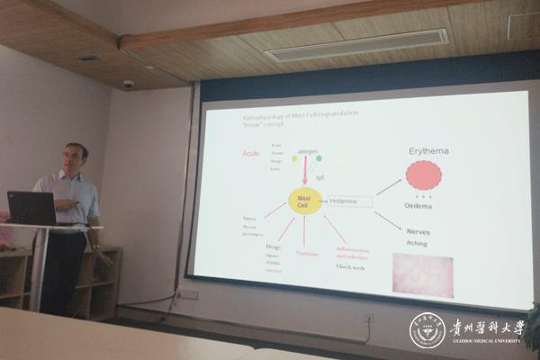Efrem Eren教授在附属医院做了题为“Hot topics in immunology and allergy”的学术报告,报告介绍了免疫系统功能综合检测治疗以及对免疫功能严重失常重大疾病的治疗研究进展。来访专家参观了贵州省药物制剂重点实验室的分析测试中心、药物制剂GMP实验室、中药民族药药效与安全性评价和中药民族药工程化实验平台等,并对实验室科研平台建设、重点科研项目、科研成果等方面给予了高度评价和充分肯定。来访专家与实验室科研人员就科学研究、人才培育等进行了交流座谈,Efrem Eren教授介绍了英国南安普顿国立医院的概况、科研条件及学术研究进展,双方对共同关注的药物活性成分筛选及药物传递系统科研工作进行了交流,并就下一步的国际科技合作方向及青年科技人员培养方案达成了共识,为今后双方进一步开展国际科技合作交流奠定了良好的基础。