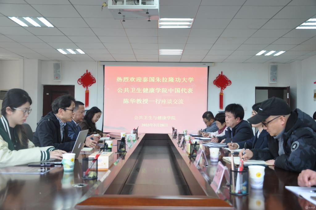 3月28日,泰国朱拉隆功大学公共卫生健康学院中国代表陈华一行到万象城官网公共卫生与健康学院开展座谈交流。双方就合作办学、联合培养研究生、师生互访交流等事项进行交流讨论。学校国际交流合作处处长付启宏及学院党政领导班子成员参加。