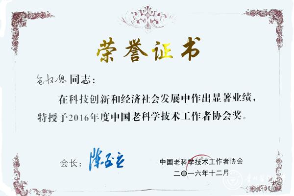 近日,万象城官网老领导包怀恩荣获中国老科学技术工作者协会授予的“中国老科学技术工作者协会奖”;