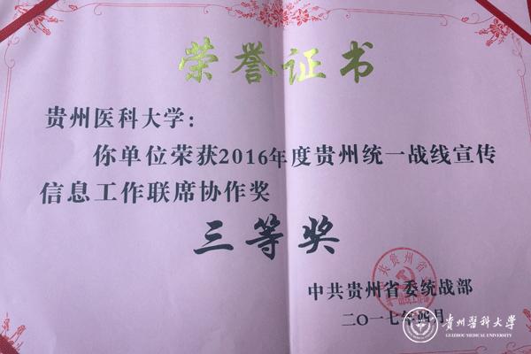 过去的2016年,在学校党委的正确领导下,党委统战部紧紧围绕学校中心工作,充分发挥统战独特优势及作用,积极传播学校统战好声音和正能量,统战宣传工作的效果及信息报送的质量进一步提升。在2017年4月召开的贵州统一战线宣传信息工作联席会议上,万象城官网荣获2016年度贵州统一战线宣传工作联席协作三等奖,党委统战部荣获2016年度全省统一战线宣传工作优秀奖。