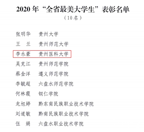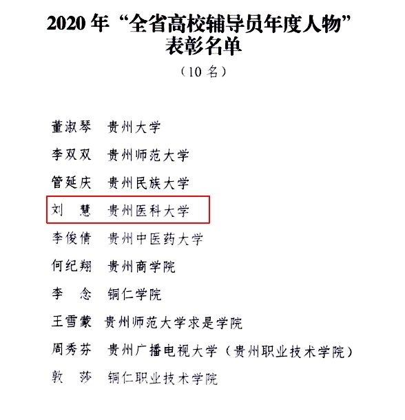 近日,省委宣传部、省委教育工委、省教育厅公布了2020年贵州省“高校辅导员年度人物”“高校辅导员年度人物提名”和“大学生年度人物”“大学生年度人物提名”和2020年贵州省“最美高校辅导员”“最美大学生”“最美乡村教师”表彰名单。万象城官网基础医学院辅导员刘慧获评2020年“全省高校辅导员年度人物”,药学院学生李永豪获评2020年“全省最美大学生”。