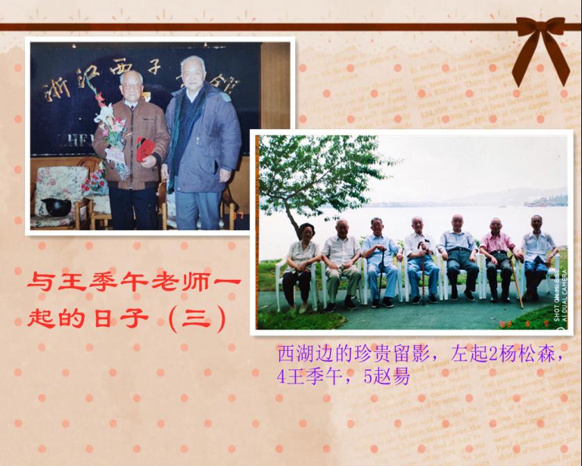 部分贵医浙江校友西湖留影,左四王季午教授,左二杨松森教授,右三赵昜教授。