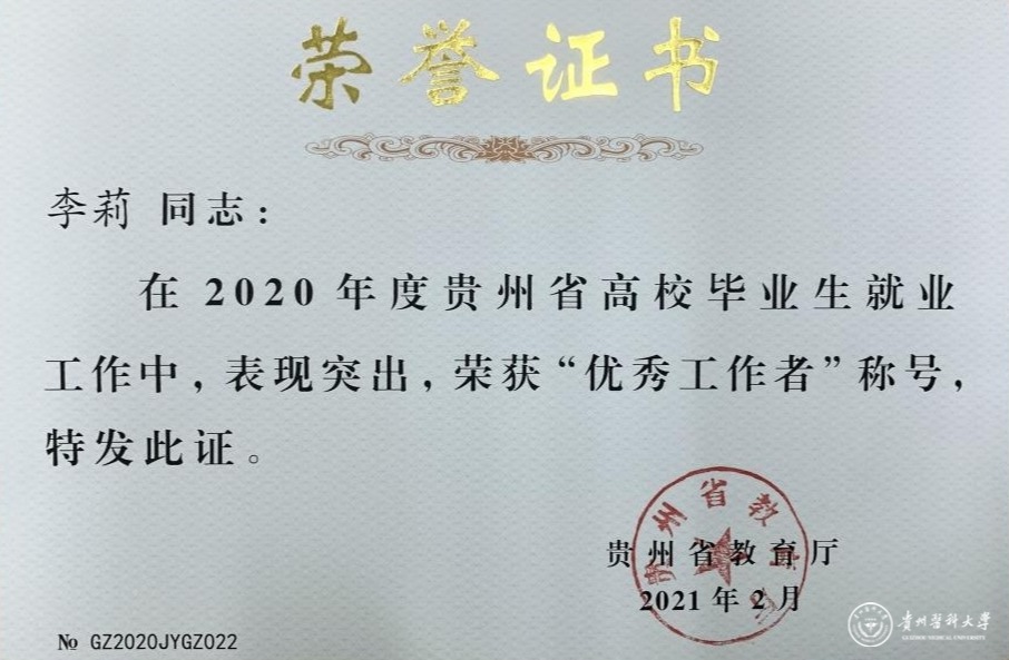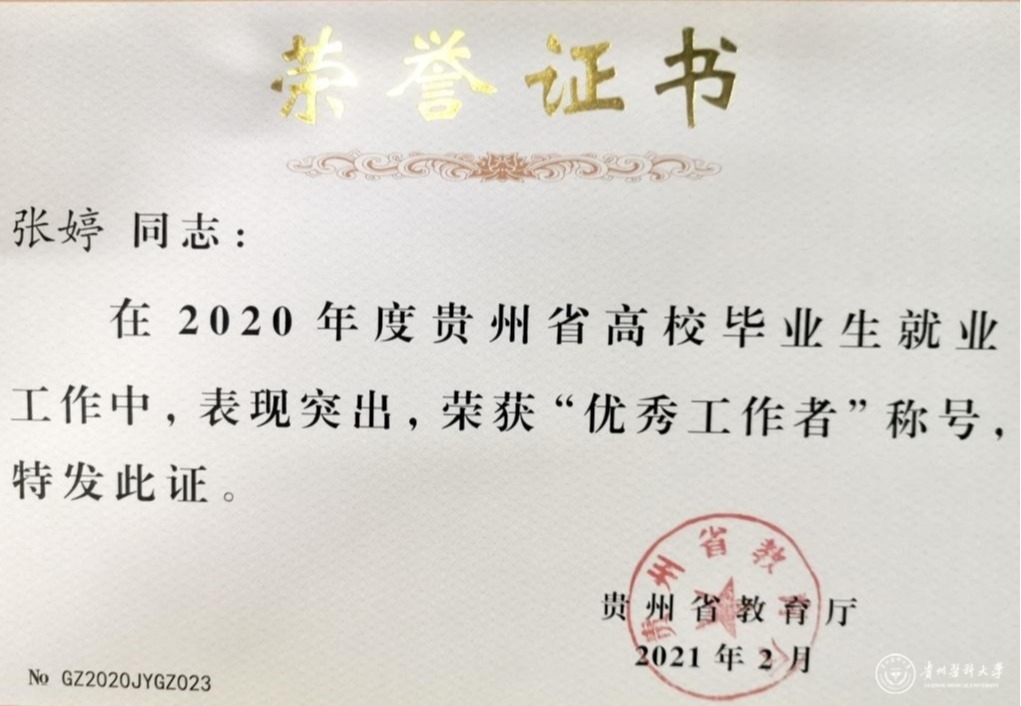 根据《贵州省教育厅关于表扬2020年高校毕业生就业工作优秀工作者的通报》,万象城官网招生就业处综合办主任张洁、临床医学院学生科科长李莉、口腔医学院学生科副科长张婷、运动与健康学院团委副书记艾登科获得“2020年贵州省高校毕业生就业工作优秀工作者”荣誉称号。