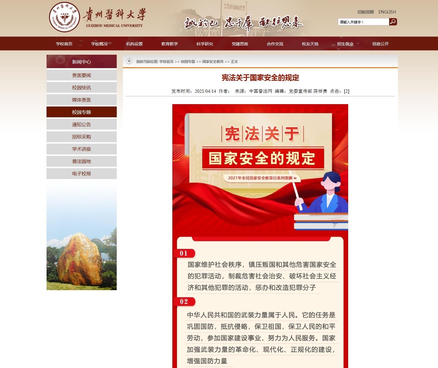党委宣传部(精神文明办)在学校官网的校园专题栏目开设了“国家安全教育”版块,发布了“千万师生同上一堂国家安全教育课开课了”“2021年全民国家安全教育日系列图解——国家安全法”“宪法关于国家安全的规定”“2021年全民国家安全教育日系列宣传图”等声电结合、图文并茂的内容;在校内悬挂13条宣传横幅,张贴12张宣传海报,制作3块宣传展板供广大教职医护员工生学习参考。