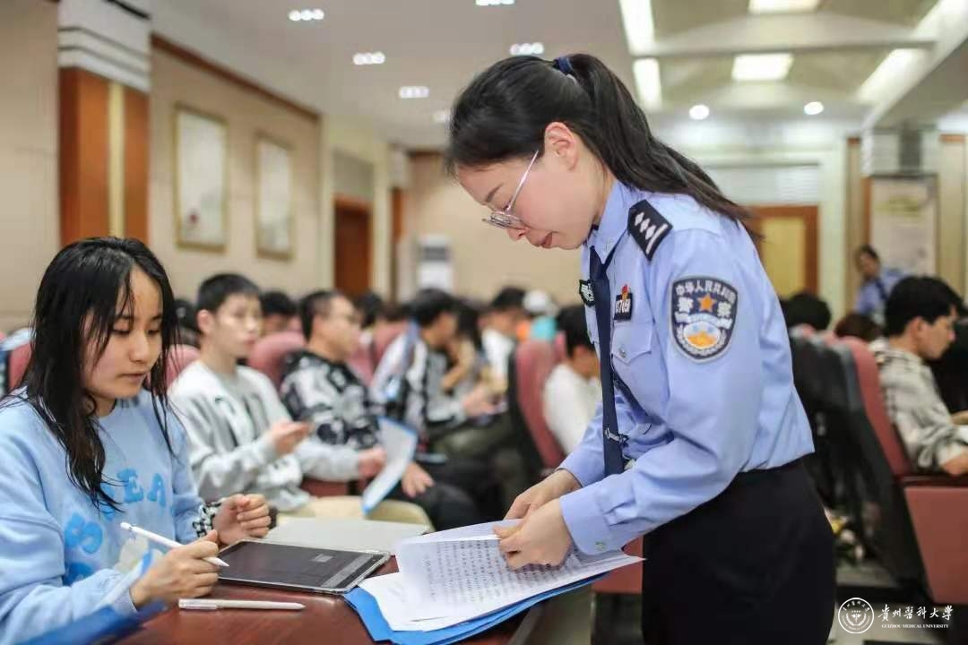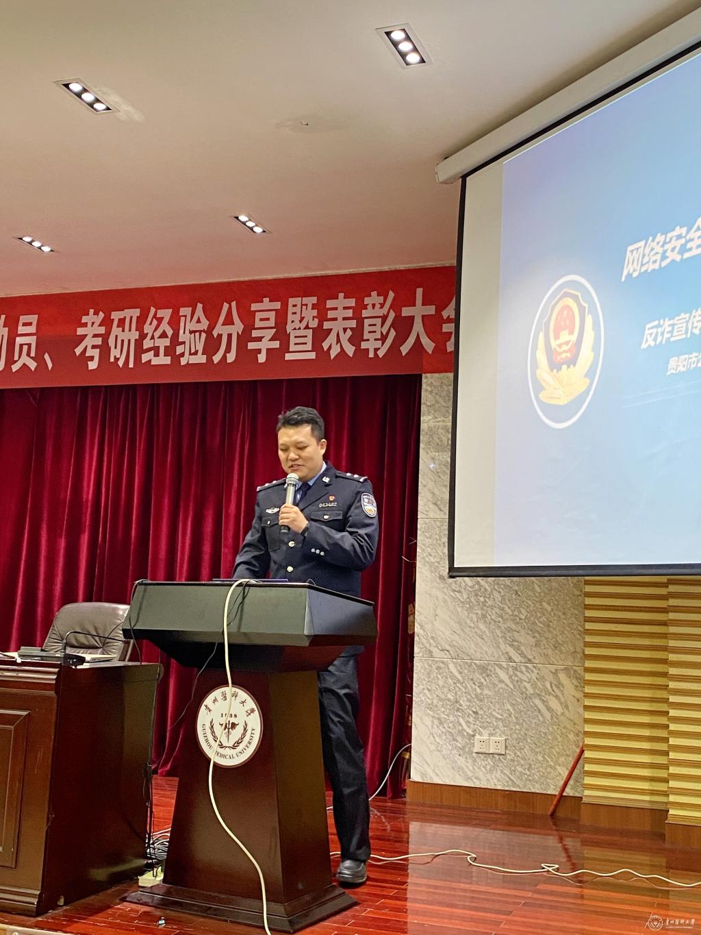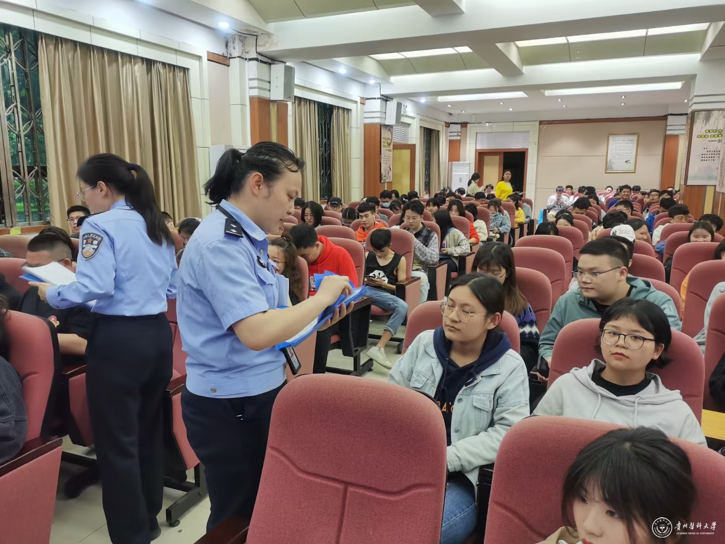 本次活动采取互动式授课、填写调查问卷及热点问题答疑交替的模式进行,来自市公安局人民警察训练部、网络安全支队、云岩分局政工室、贵乌路、宅吉路派出所等单位的主要领导及青年警官轮流为同学们授课解惑,与即将毕业踏入职场的学子交流互动。“你问我答、我疑你解”,现场气氛活跃、掌声不断。其中刘丁豪警官所作的反诈知识专题讲座,以其生动幽默又不失专业素养的讲述手法,不仅简单明晰的归纳了电信网络诈骗常用手段、典型案例的共通点、96110全国反诈骗中心运作模式、防范诈骗小妙招等关键知识点,还穿插播放了公安机关重拳出击查处国内大案要案、顶住新冠肺炎疫情困难跨国出击抓捕犯罪分子等令人振奋的视频片段,受到现场同学们的一致好评,纷纷表示这不是一次“被动式”讲座培训,而是一场让人大有收获、记得住弄得懂并值得传播分享的实践活动,切实达到了“启发一人带动一片”的最佳宣传教育效果。