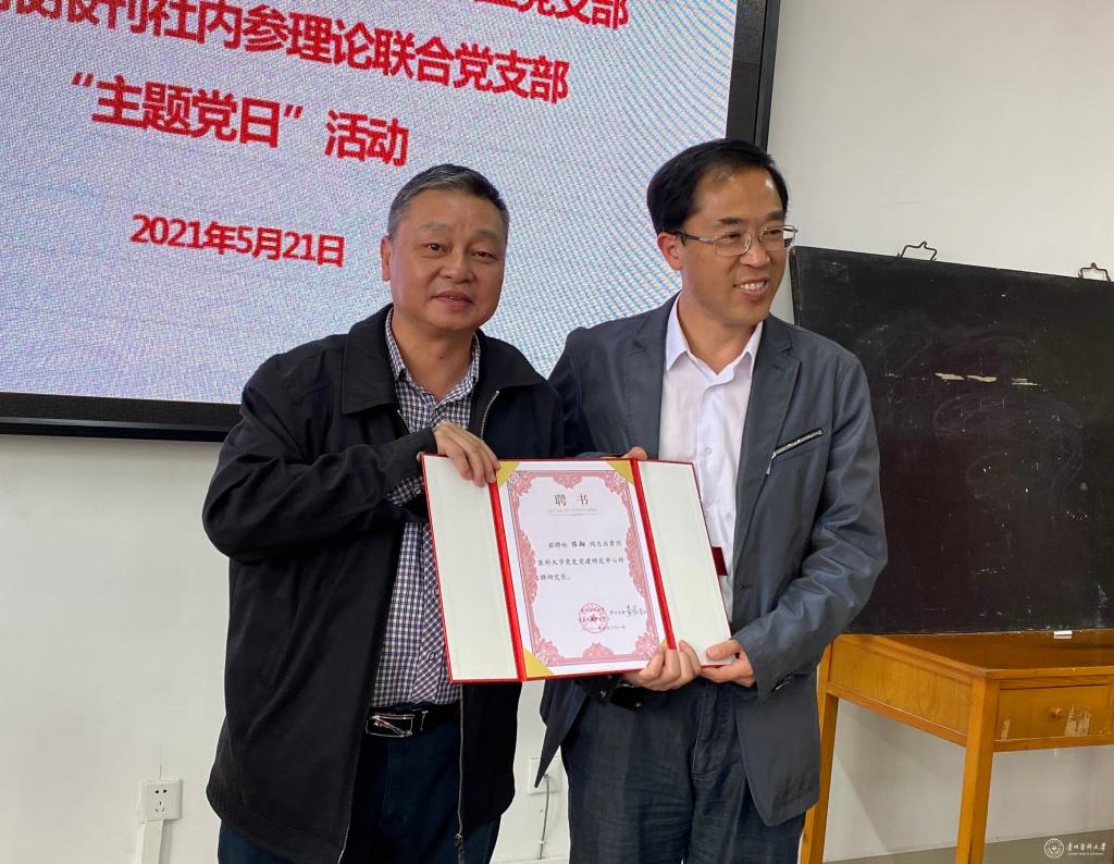 “主题党日”活动中,举行了党史党建研究中心特聘研究员聘任仪式。战勇向陈翔、肖郎平、徐海星3位同志颁发了awc777万象城娱乐官网党史党建研究中心特聘研究员聘书,代表学校感谢贵州日报社长期以来对学校的关心与支持,希望贵州日报社继续关注指导马克思主义学院的建设发展。