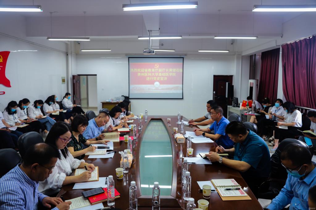 6月18日,学校特邀请省教育厅党组成员、副厅长、省委教育工委委员黄健到基础医学院,为教工第五党支部进行党史学习教育宣讲。会议由副校长曾柱主持。省教育厅人事处处长、一级调研员李扬波,省教育厅人事处四级调研员刘涛,校党委委员、党委组织部部长蒋红梅,校党委委员、党委宣传部(精神文明办)部长(主任)、党委统战部部长陈颖出席。基础医学院党政领导、科级干部、党支部书记、青年博士、辅导员及协和班学生代表参加。