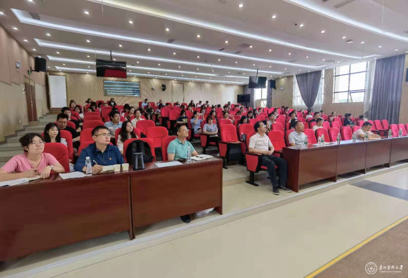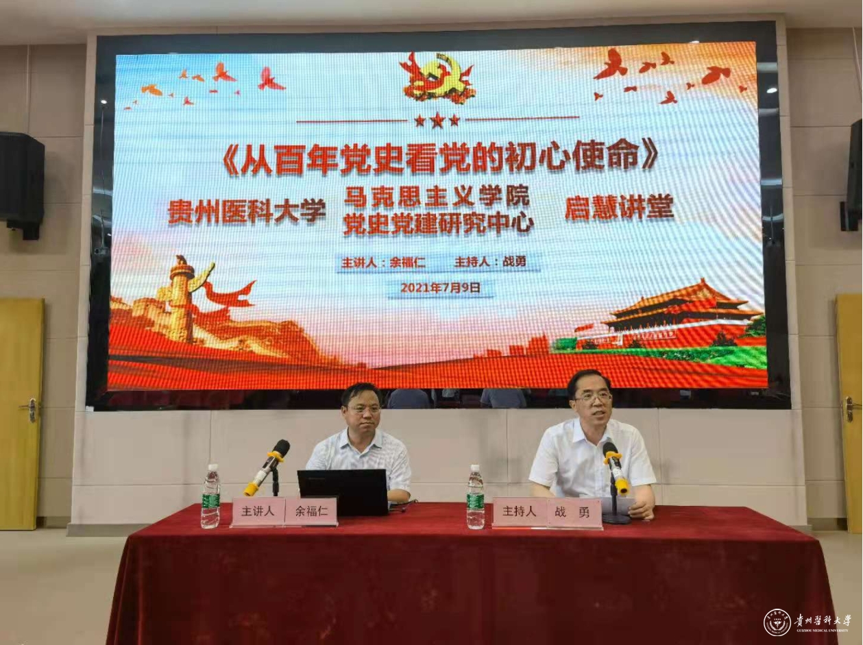 7月9日,马克思主义学院、党史党建研究中心、党委学生工作部以“启慧讲堂”学术讲座形式在南校区广德楼六楼录播室举行党史学习教育暨“牢记殷切嘱托、忠诚干净担当、喜迎建党百年”专题教育宣讲报告会。贵州省委党史学习教育宣讲团成员、中共贵州省委党史研究室副主任余福仁受邀,作题为“从百年党史看党的初心使命”的专题报告会。学校党委副书记战勇出席并主持;马克思主义学院党委书记、党史党建研究中心主任黄鑫权,党委学生工作部(学生处)部长(处长)王韬,马克思主义学院党委副书记王万江,党委委员禹辉映、凌富亚及全体教师和学校辅导员参加。