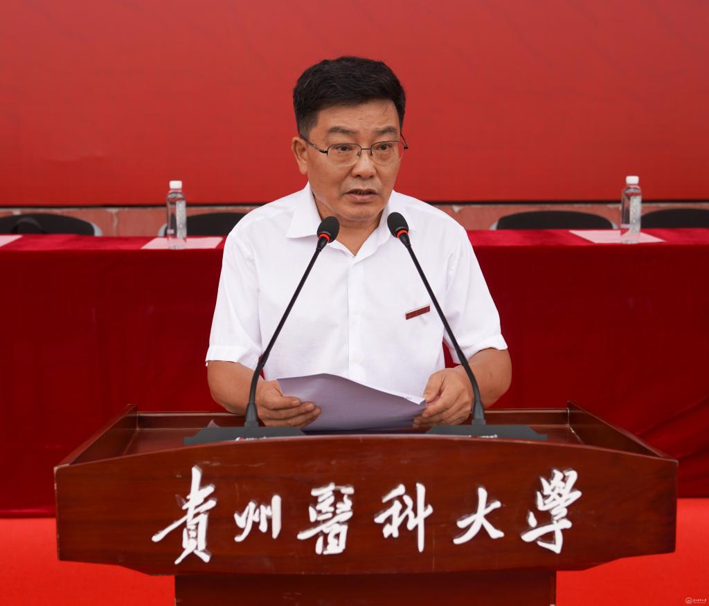 罗鹏代表学校对新同学的到来表示热烈欢迎,向承担本次军训任务的教官致以亲切慰问。他说,学校有着悠久的办学历史和优秀的育人传统,创建于1938年,其前身国立贵阳医学院,有着“小协和”之美誉,同学们来到贵医,源于有着与学校办学治校理念相契合的特质,未来将在贵医团结、向上、和谐、自由、奋进、创新的氛围中学习生活。他对新生们提出希望:要树立远大志向,心怀国之大者;要锤炼品德修为,焕发青春绚丽光彩;要刻苦研学,练就过硬本领;要强健体魄,支撑起全民健康事业。希望同学们以青春之我、奋斗之我,融入时代进步、国家强盛、民族复兴、人民幸福的时代洪流,向实现第二个百年奋斗目标不断奋进。