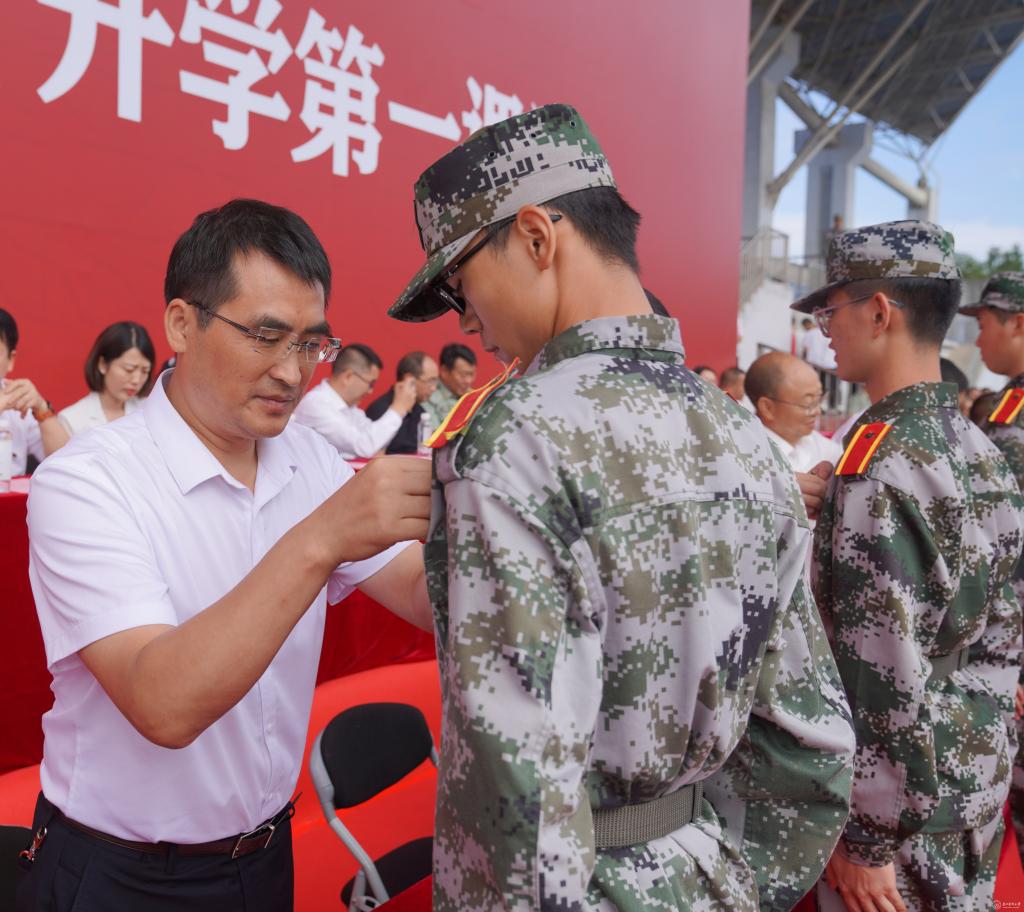 校领导为2021级新生代表佩戴校徽,全体新生自己佩戴校徽。