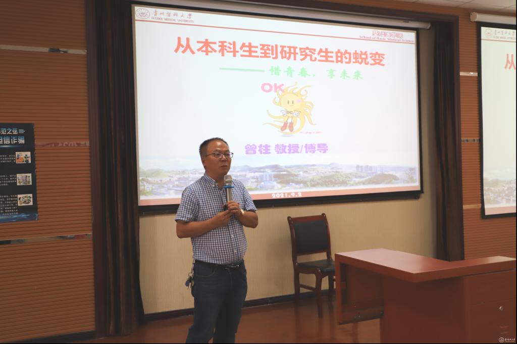 基础医学院院长禹文峰对新同学的到来表示欢迎,并和新生谈了开展科学研究的几点思考和建议,希望同学们在研究生学习阶段能够有所收获。