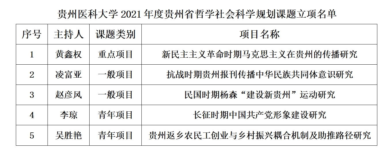 在立项课题中,《新民主主义革命时期马克思主义在贵州的传播研究》获批重点课题,实现了学校该级别重点项目零的突破。近年来,学校持续加大人文社科相关学院内涵发展的支持力度,科学技术处在项目培育、组织动员、申请书质量提升以及政策支持等方面加大工作力度,以目标为导向大力推动人文社科项目申报工作,切实为人文社科学科建设打下坚实基础。