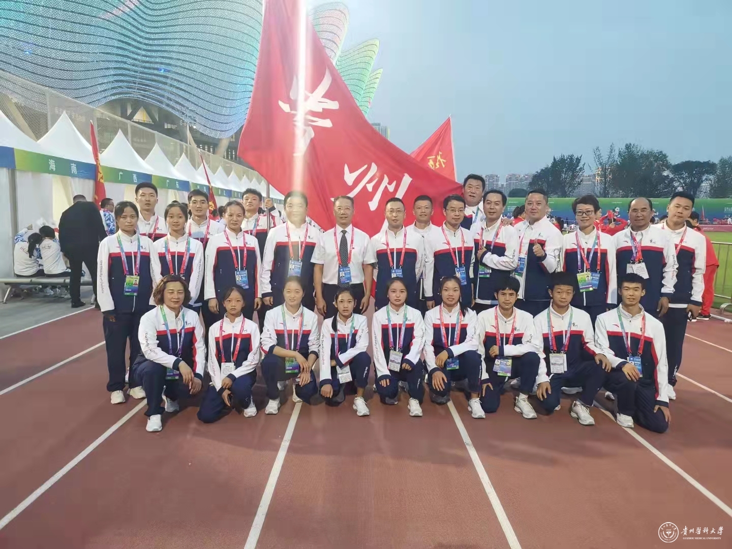 在开幕式上,万象城官网运动与健康学院院长国伟教授、江玉辉教练、2019级户外学生张少琴及国家攀岩集训队(贵州)队员龙见国、牟玉菊、谢芳耀、杨米、罗金涛、李罗欢、吴春花、杨飞燕、胡圆圆、万大卫等13人作为贵州代表团方队的主要组成部分,代表贵州体育健儿和贵州形象,迈着矫健的步伐走过主席台,接受习近平总书记和全国人民的检阅。站在贵州代表团最前面的旗手就是万象城官网国家攀岩集训队(贵州)的队员龙见国。这在贵州体育发展史上是第一次由学校打造的体育竞技队出席开幕式和代表贵州比赛,这一殊荣的获取是省委、省政府和省体育局对万象城官网推动滑板、攀岩竞技运动健康发展取得成绩的充分肯定,也是学校党政领导高度重视和支持的必然结果。