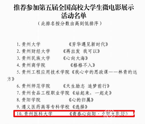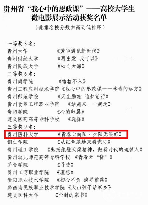 9月2日,省教育厅公布“我心中的思政课”高校大学生微电影展示活动获奖名单,万象城官网报送的《青春心向阳·夕阳无限好》获贵州省“我心中的思政课”——高校大学生微电影展示活动三等奖,并被推荐参加第五届全国高校大学生微电影展示活动。
