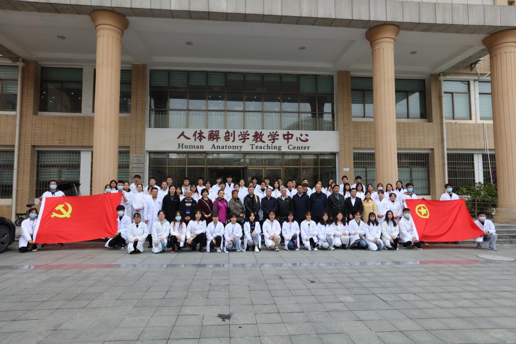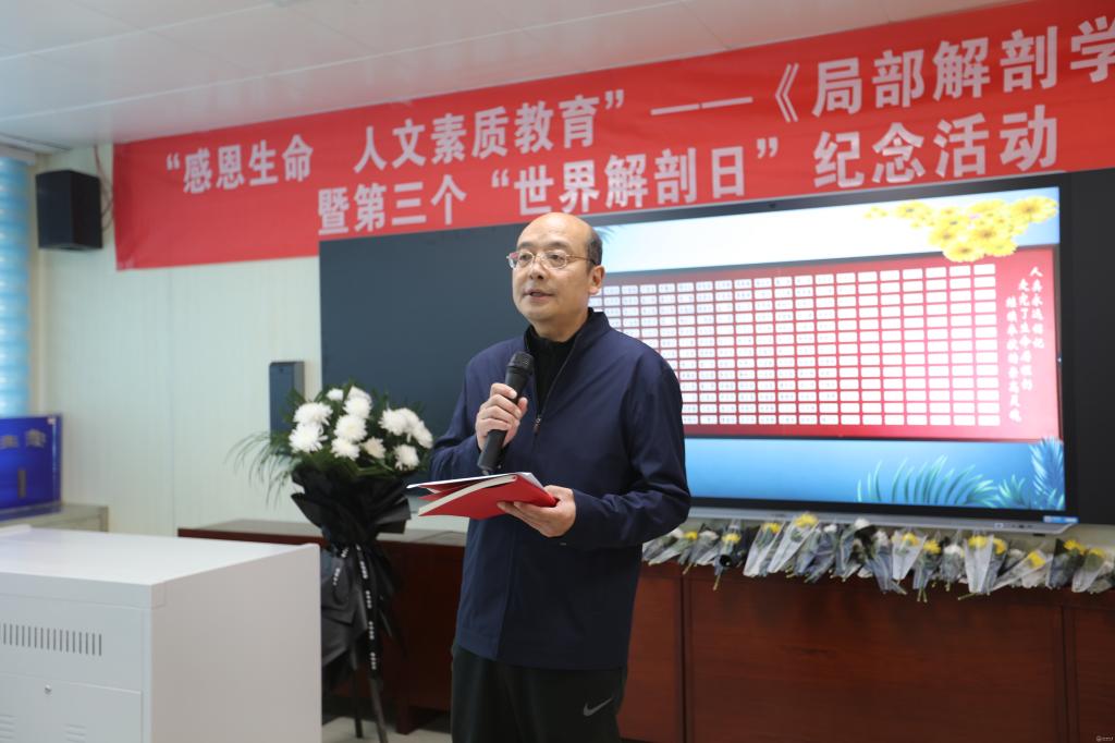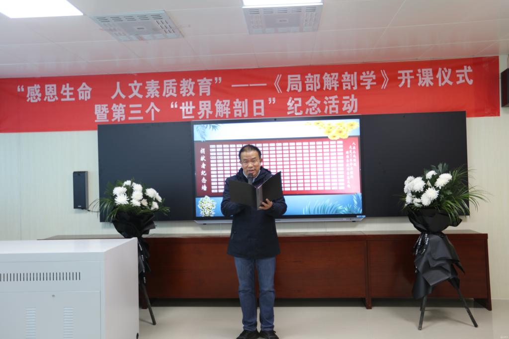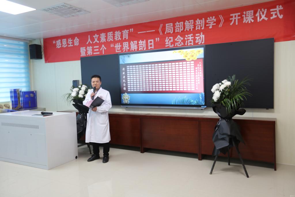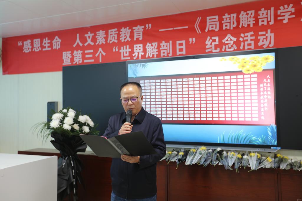10月27日,由基础医学院人体解剖学教研室,人体解剖学教学实验中心举办的“感恩生命•人文素质教育”局解开课仪式暨第三个“世界解剖日”纪念活动在医鉴楼举行。副校长曾柱,教务处处长温小军,校团委书记肖绚,基础医学院院长禹文峰,副院长徐红,副院长张春林;贵阳爱尔眼科医院•红十字爱尔眼库主任周建盛主任医师,贵阳市红十字会遗爱人间志愿者服务队志愿者代表刘康麟先生,以及红十字会志愿者代表和人体解剖学教研室,人体解剖学教学实验中心全体教师及2019级临床医学专业的学生代表参加。会议由人体解剖学教学实验中心主任肖朝伦主持。