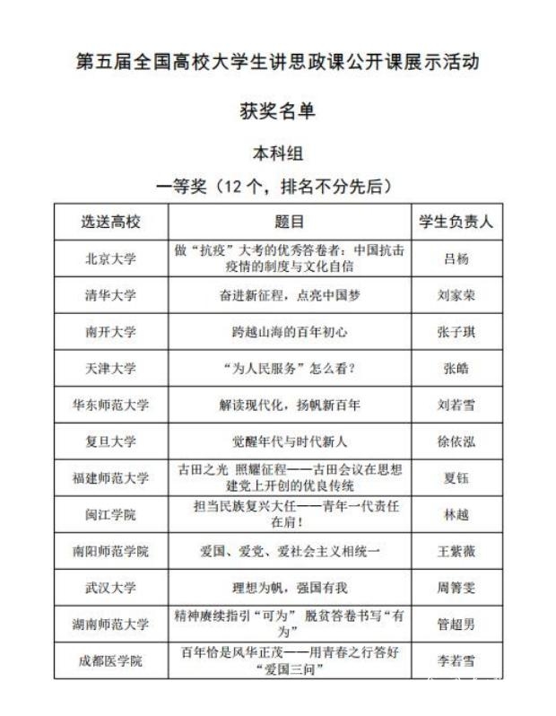 经过网络评审、现场展示交流暨决赛,由马克思主义中国化教研室副主任、党史党建研究中心专职副主任禹辉映团队指导,基础医学院学生刘丹黎主讲的《从百年党史中汲取坚定文化自信的磅礴力量》以贵州省一等奖第一名的成绩获教育厅推送至教育部参加第五届全国高校大学生讲思政课公开课展示活动。12 月 1 日,教育部公布了获奖名单,该作品荣获全国三等奖,为贵州省推送作品取得的最好成绩。
