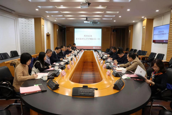 12月8日,校党委副书记、校长罗鹏,副校长曾柱、沈祥春带领校办公室、科学技术处、发展与规划处、附属医院科技处、转化医学研究中心等部门负责同志赴苏州大学开展交流。共同商讨两校共建联合实验室的工作,交流座谈会在苏州大学天赐庄校区红楼会议中心217室召开,苏州大学校长熊思东、党委副书记邓敏出席,苏大校长办公室、国内合作办公室、科技处、研究生院、医学院等部门负责同志参加,会议由邓敏主持。