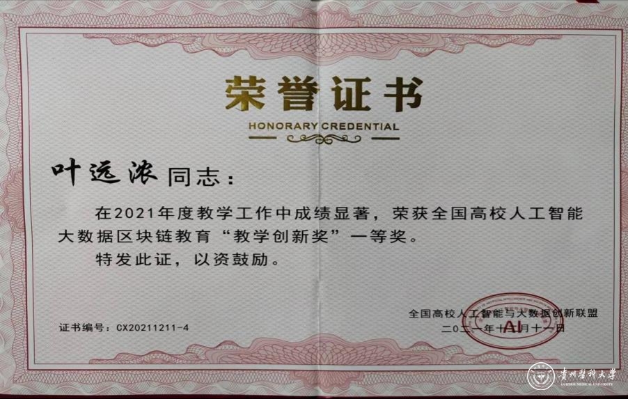 12月11日,由教育部中国教育发展战略学会、科技部科技人才交流开发服务中心指导,全国高校人工智能与大数据创新联盟主办、电子科技大学、佛山市人工智能学会、黑龙江省高等教育学会人工智能教育专业委员会等26家单位和机构协办的“2021第四届全国高校人工智能大数据区块链创新论坛”在北京召开。在会议现场,全国高校人工智能与大数据创新联盟向来自全国52位教师24所高校代表颁发了人工智能大数据区块链教育教学“创新奖”。awc777万象城娱乐官网获“2021年度大数据专业(方向)最具发展潜力和创新力高校奖”一等奖。大健康学院副院长叶远浓获“全国高校人工智能大数据区块链‘教学创新奖’”一等奖。