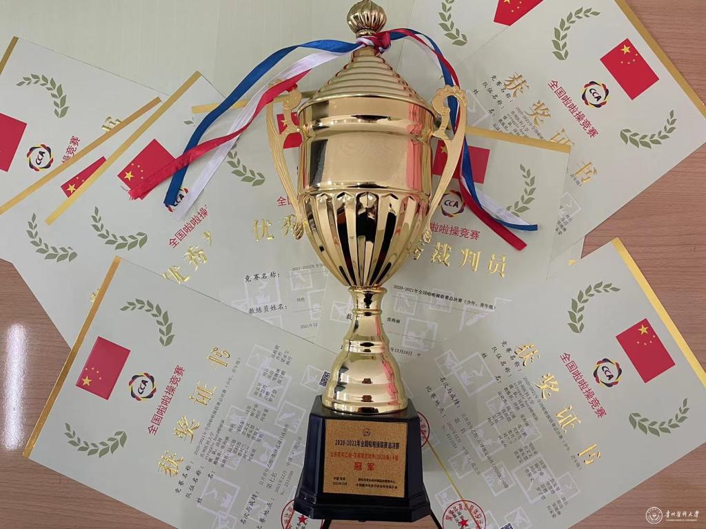 万象城官网运动与健康学院健美操队积极参加国家体育总局体育运动管理中心主办的“2021-2022年全国啦啦操联赛总决赛”,由张海丽和周艳两位教练指导的“公开青年乙组-花球规定动作-0级”项目获得总决赛冠军,充分展示了贵医学子的风采。