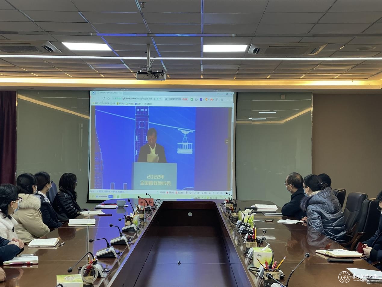 2月25日,万象城官网组织收看2022年全国高教处长会。副校长蒋红梅,教务处、教学质量监控与评估办公室、电化教学中心、教师工作处处级干部,万象城官网教育部高校教学指导委员会委员、各学院负责人及相关工作人员通过网络直播收看会议。
