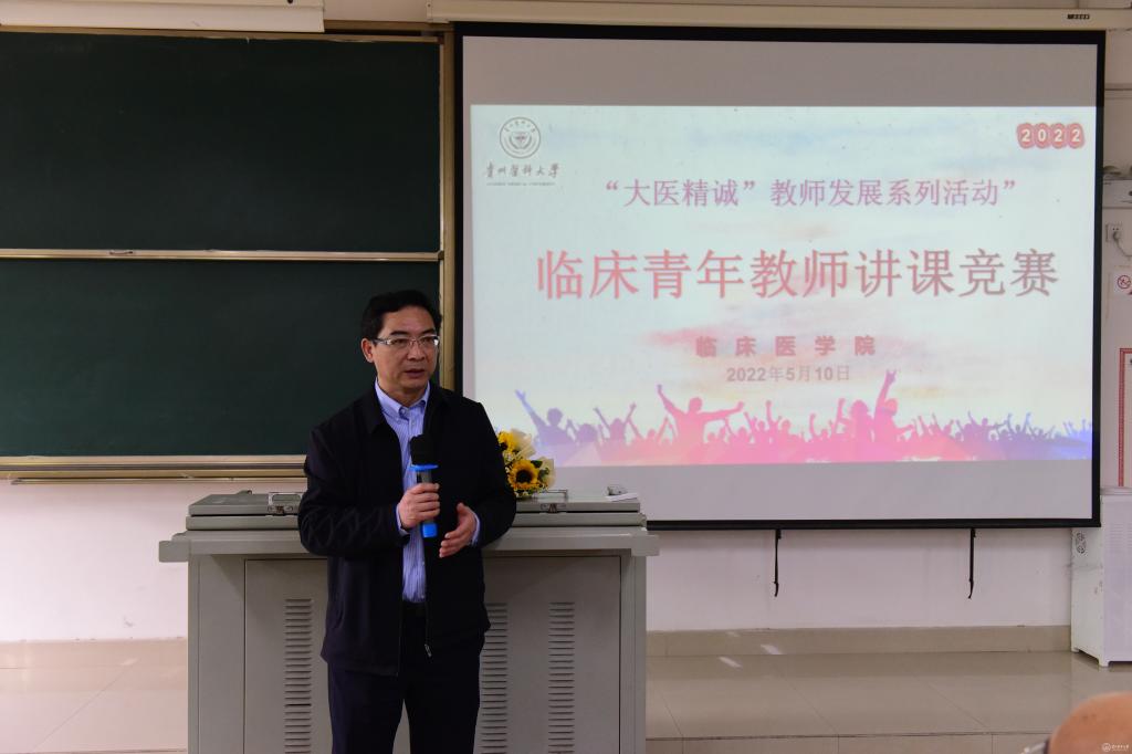 5月10日,临床医学院在4401教室开展2022年度青年教师讲课竞赛。校党委委员、附属医院党委书记、临床医学院党委书记李海洋,教务处处长温小军,党委教师工作部(教师工作处)处长徐国强,附属医院副院长、临床医学院副院长楚兰及临床医学院领导班子成员出席比赛。教务处副处长修江帆,临床医学院副院长戚璐,基础医学院生物学系主任杨明,影像学院影像诊断教研室副主任阮志兵,基础医学院病理生理学教研室杨婷老师以及“协和班”同学代表担任评委。此次竞赛共有内科学、外科学、妇产科学、病理学等15个教研室共15位教师参赛。临床医学院各教研室主任及教师代表到场观赛。