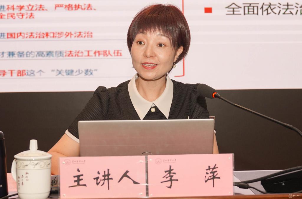 在报告会中,李萍围绕“法律之治”“良法善治”“法治与德治”三个方面,通过一个个鲜活的案例,对习近平法治思想作了深入浅出的阐释。李萍指出,习近平法治思想是在中国特色社会主义法治建设伟大实践中创立的科学理论体系,其内涵丰富、论述深刻、逻辑严密、系统完备,其核心要义是“十一个坚持”。她勉励同学们,法律的权威源自人民的内心拥护和真诚信仰,要让尊法、学法、信法、守法成为共同追求和自觉行动。