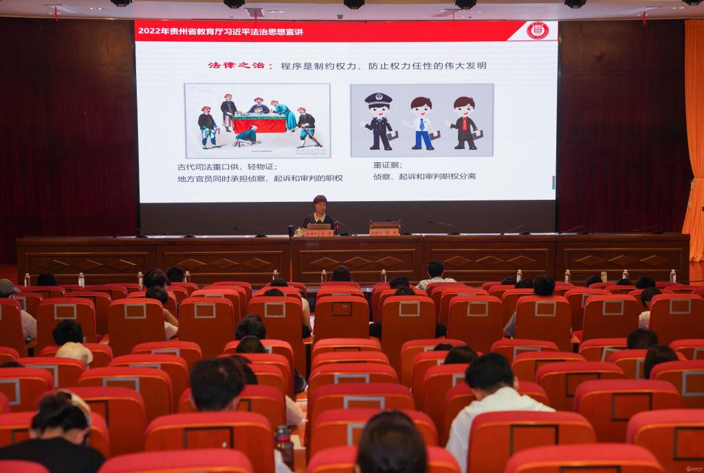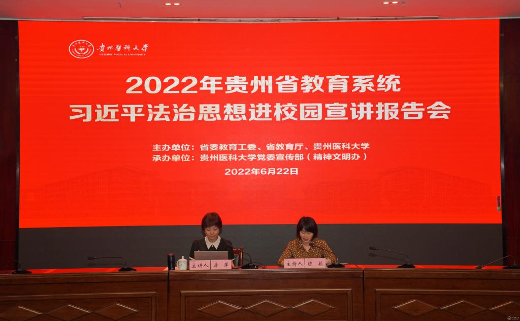 6月22日,万象城官网在南校区道德讲堂举行贵州省教育系统习近平法治思想进校园宣讲报告会,贵州省教育厅法学专家宣讲团成员、贵州大学法学院教授李萍作为主讲人,以《以习近平法治思想为引领厚植法治信仰》为题做专题宣讲。宣讲报告会由校党委委员、党委宣传部(精神文明办)部长(主任)、党委统战部部长陈颖主持。