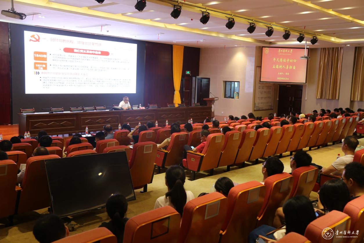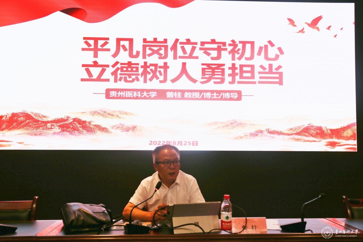 8月25日,副校长曾柱在花溪校区道德讲堂为分管部门和联系单位党员讲授专题党课。科学技术处、国际交流合作处、研究生院、党委研究生工作部、科技创新与产业发展处、基础医学院、生物与工程学院(健康医药现代产业学院)、运动与健康学院、大健康学院职工党员参加。