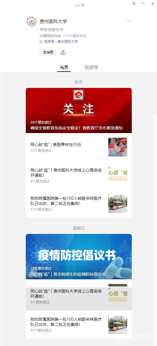 学校通过官网、官微及短视频平台加强宣传引导,及时发布学校疫情防控通知和提示,充分报道学校各部门落实学校党委部署要求的具体做法和措施成效,制作推送《同心战“疫”贵医青年在行动》,全面展现贵医师生团结一心、奋力战“疫”的精神风貌。落实意识形态工作责任制,发挥导师、辅导员、班主任等育人队伍作用,强化师生思想引导,鼓励学生“线上”学习。