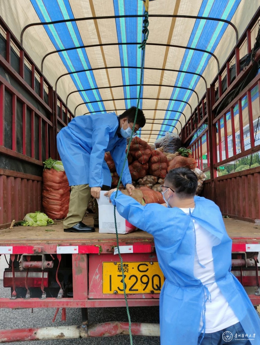 当日中午,车辆停在了大学城站,后勤管理处的同志们将一箱箱、一袋袋、一捆捆蔬菜水果转运装车搬运到食堂库房。