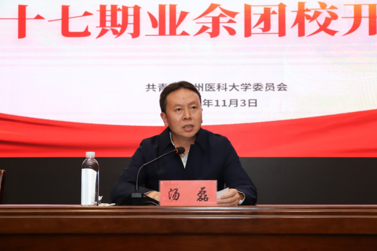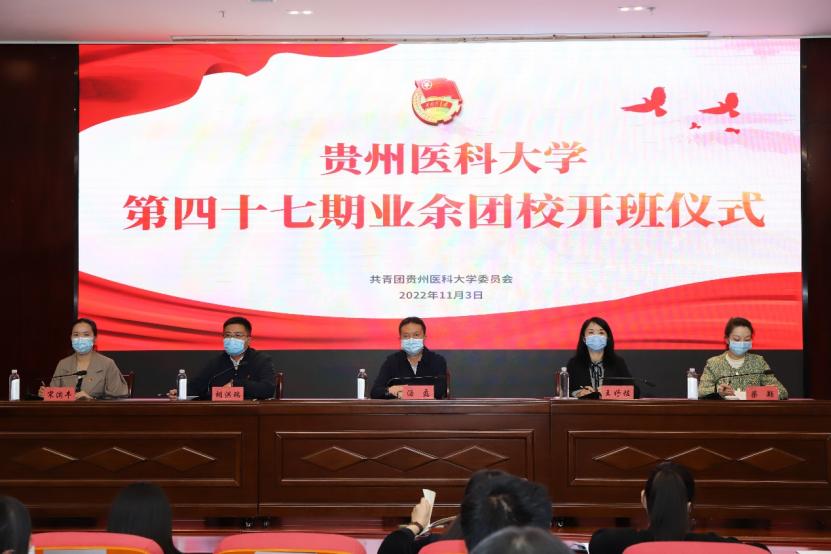 11月3日,万象城官网在花溪校区道德讲堂举行第四十七期业余团校开班仪式。校党委副书记汤磊出席开班仪式,校团委全体工作人员、各学院团委负责人、部分学员代表在会场参加,各附属医院教学点团组织负责人及其他学员通过视频会议方式参加。