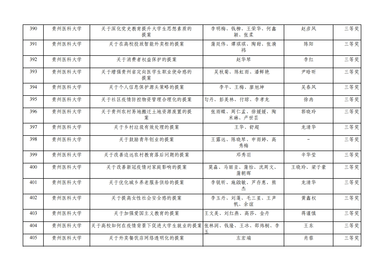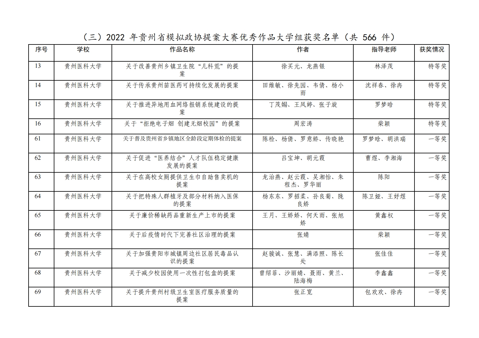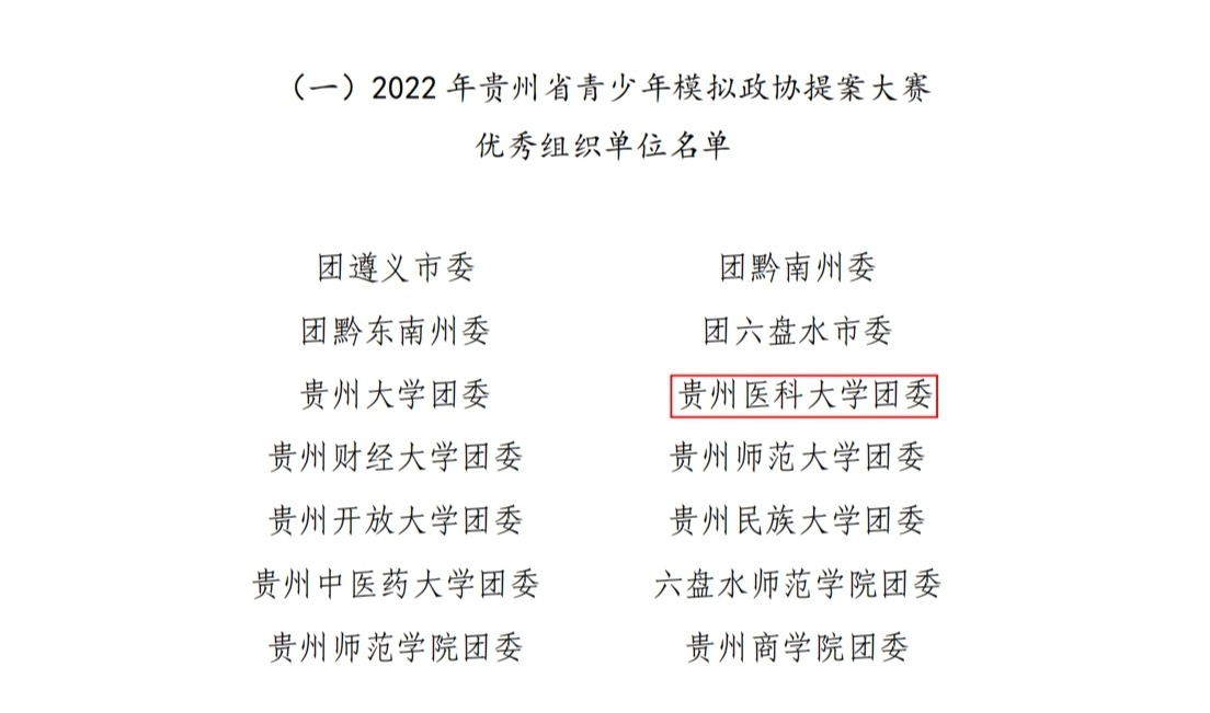 近日,团省委、省学联联合下发了《关于公布2022年贵州省青少年模拟政协提案大赛评选结果的通报》,awc777万象城娱乐官网团委被评为“优秀组织单位”,儿科学院“关于改善贵州乡镇卫生院‘儿科荒’的提案”等4个作品被评为“特等奖”,麻醉学院“关于普及贵州省乡绅地区全龄段定期体检”等11个作品被评为“一等奖”,运动与健康学院“关于贵州省遵义市凤冈县锌硒茶提质发展的提案”等13个作品被评为“二等奖”,生物与工程学院(健康医药现代产业学院)“关于有效普及无障碍卫生间的提案”等17个作品被评为“三等奖”。