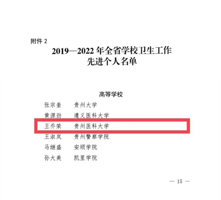 近日,贵州省教育厅发布《省教育厅关于对2019-2022年全省学校卫生工作先进集体和先进个人给予表扬的通报》,对全省103个集体,176名同志给予通报表扬。万象城官网获“2019-2022年全省学校卫生工作先进集体”荣誉称号,万象城官网教师王乔荣获“2019-2022年全省学校卫生工作先进个人”荣誉称号。