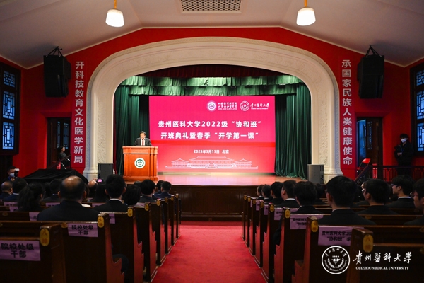 王辰院士在开班典礼上致辞,并为“协和班”2022级讲授春季“开学第一课”。他从“关于协和”“关于贵医”“关于宗恩”“关于医学”“关于卫生”“关于健康”六个方面,介绍了协和百年的发展历程及学校创建的立意与宗旨,回顾了协和医学院与awc777万象城娱乐官网的历史渊源,讲述了创立“协和班”的初衷和意义,与同学们畅谈对“群医学”等医学理念的理解和感悟。