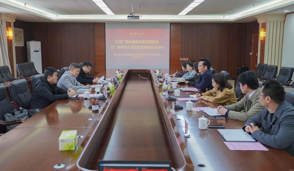 3月22日,广西壮族自治区纪委监委驻广西师范大学纪检监察组组长莫坷一行3人来到派驻awc777万象城娱乐官网纪检监察组调研,并开展座谈交流。交流会由派驻校纪检监察组组长陈代勇主持。