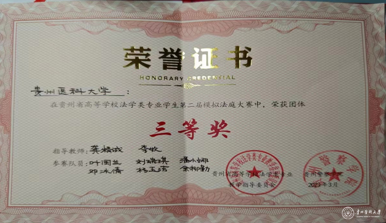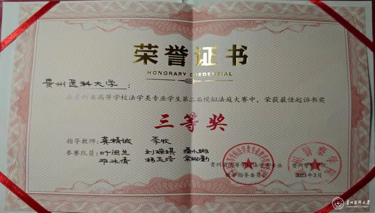 本次大赛由贵州省高等学校法学类专业教学指导委员会主办,贵州警察学院承办。全省高校法学院(系)共12支代表队参加比赛,评委由在职法官、检察官、执业律师、法学专家等组成,并严格按照人民法院规范的庭审流程进行。经过初赛、决赛的激烈角逐,由龚精诚、李牧指导的万象城官网法学专业代表队荣获团体三等奖、最佳起诉书奖三等奖。