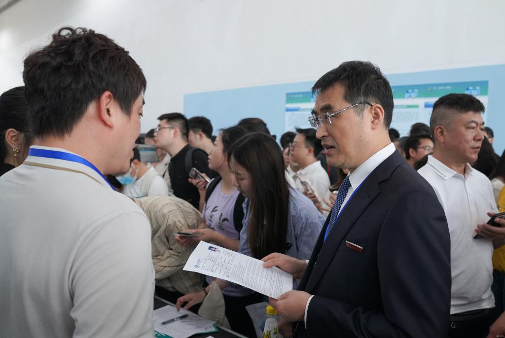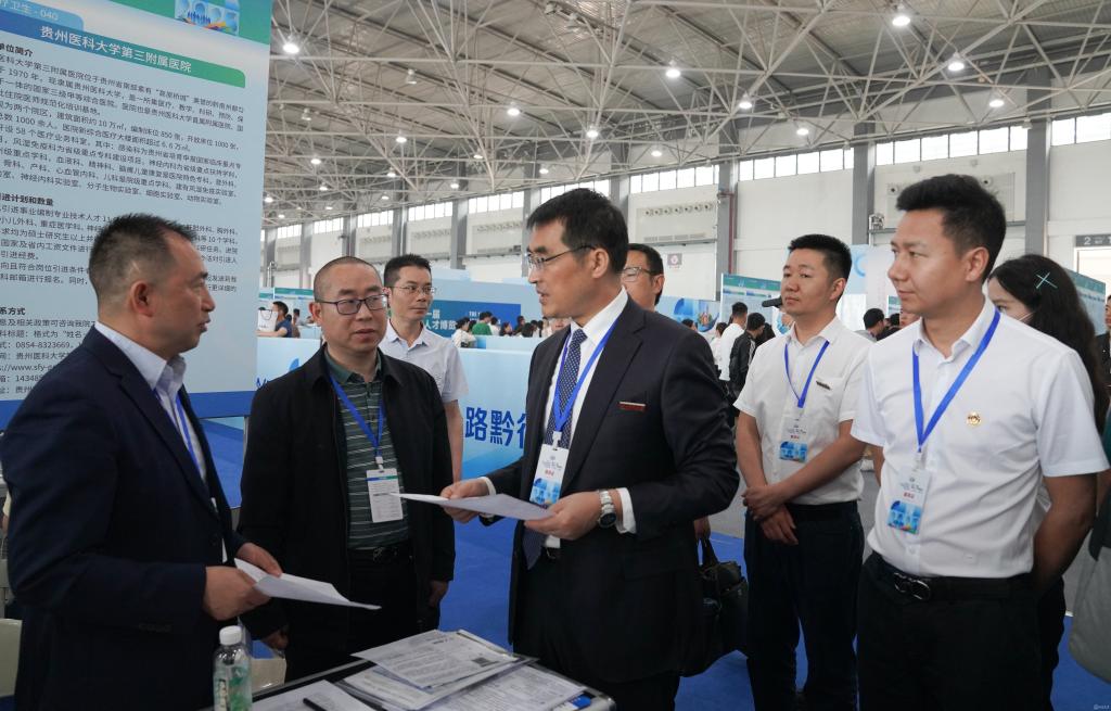 罗鹏到学校、附属医院、第二附属医院、第三附属医院、附属口腔医院、贵州省天然产物研究中心引才展位看望慰问工作人员,仔细了解各单位引才政策及简历投递情况,并与有入职意向的高层次人才亲切交流。