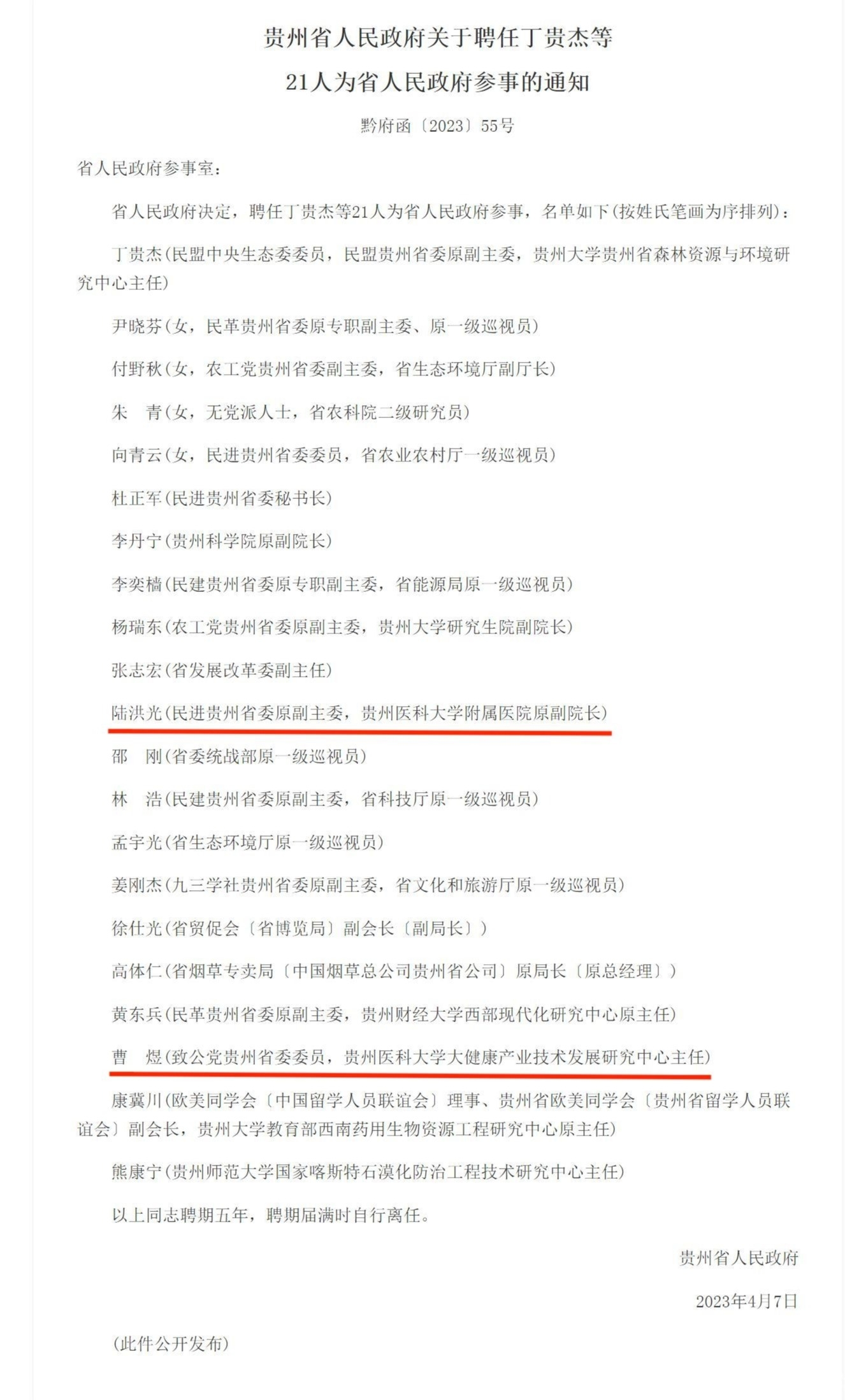 近日,贵州省人民政府发布《贵州省人民政府关于聘任丁贵杰等21人为省人民政府参事的通知》(黔府函〔2023〕55号),民进贵州省委原副主委、贵州省欧美同学会会长、万象城官网附属医院原副院长陆洪光,致公党贵州省委委员、万象城官网大健康产业技术发展研究中心主任曹煜聘为省人民政府参事,聘期5年。