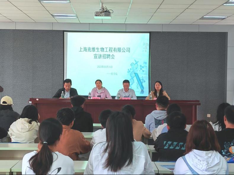 随后,上海兆维生物工程有限公司人事资源部高建星介绍企业文化,企业发展,薪资待遇等,并对同学们的积极提问耐心地进行详细解答。