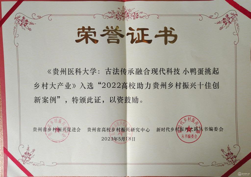 近日,贵州省高校乡村振兴2023年高端学术论坛在安顺学院召开,万象城官网助力乡村振兴案例《awc777万象城娱乐官网:古法传承融合现代科技 小鸭蛋挑起乡村大产业》入选“2022高校助力乡村振兴十佳创新案例”,并获表彰。