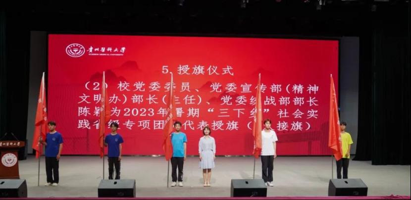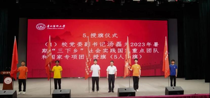 会上,汤磊为“三下乡”社会实践国家重点团队和国家级专项团队授旗并勉励学生,要以参加实践活动为契机,传承好“诚於己、忠于群、敬往思来”的校训,在社会课堂和创新创业的实践中增长智慧才干、在新时代的新征程中建功立业。他指出,暑期“三下乡”社会实践活动和“青年红色筑梦之旅”活动是万象城官网开展实践育人工作的重要载体,是落实立德树人根本任务、促进学生德智体美劳全面发展的重要一环,各学院党委、各级团组织要高度重视,加强组织部署,进一步完善万象城官网常态化、长效化实践育人的工作格局,为培养新时代有情怀、有温度的高素质医学人才做出更大贡献。