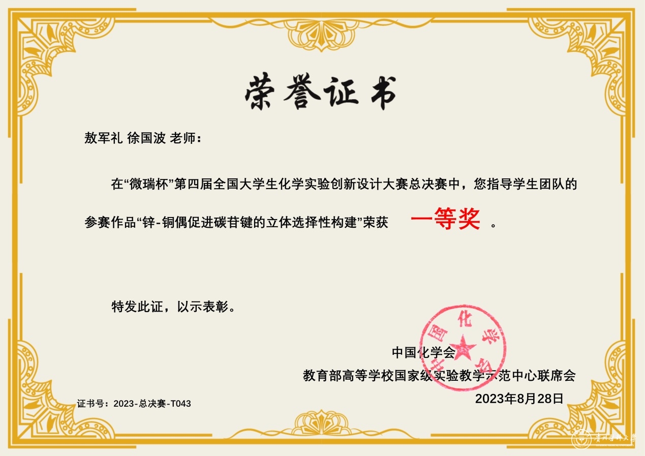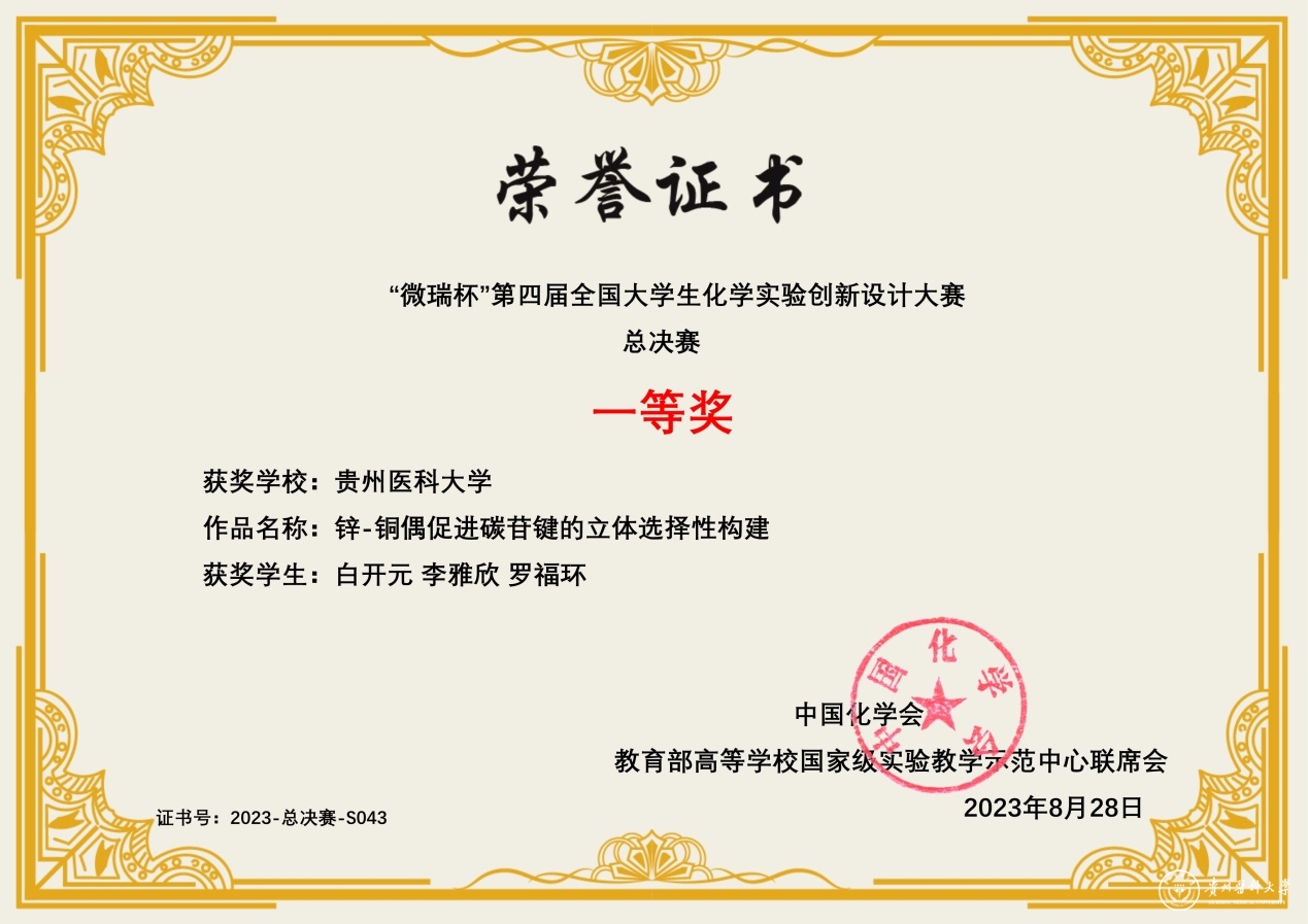 近日,中国化学会和教育部高等学校国家级实验教学示范中心联合主办的“微瑞杯”第四届全国大学生化学实验创新设计大赛总决赛在浙江大学举行。万象城官网药学院教师敖军礼和徐国波指导本科生白开元、李雅欣、罗福环的创新实验《锌-铜偶促进碳苷键的立体选择性构建》,获西南赛区一等奖。在西南赛区一等奖的附加赛中再次晋级全国总决赛,在总决赛的激烈角逐中最终斩获全国一等奖。