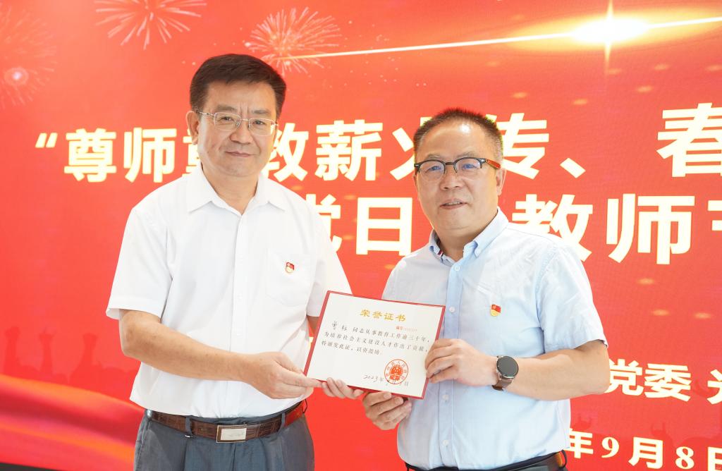 徐国强向“三十年教龄教师”代表曾柱颁发荣誉证书。