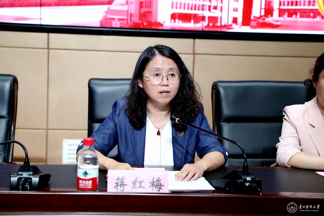 蒋红梅向新入学的同学们表示欢迎,并介绍学校的历史和现在的办学情况。她要求,同学们要涵养家国天下的“大格局”,做有高度的“贵医人”,将家国情怀融入医者仁心,用心领会“诚於己、忠于群、敬往思来”的贵医校训内涵,努力成为“立大志、明大德、成大才、担大任”的时代新人。要树立成就梦想的“大志向”,做有气度的“贵医人”,永葆医学初心,涵养讲奉献能担当的高尚道德品格,练就迎难而上、攻坚克难的勇气与信心和敢闯敢干、绝不言弃的胆识与气魄,做守护人民群众健康的行业新军,为贵州医疗卫生事业发展注入更多的新鲜血液与动力。要抱定勤能补拙的“大智慧”,做有厚度的“贵医人”,注重创新精神和创新能力的培养,主动学习专业知识,不断提高自身的专业修养和社会实践能力,努力提升为人民健康服务的本领。要秉承济世救人的“大情怀”,做有温度的“贵医人”,从中华民族传统美德中汲取道德滋养,从英雄人物和时代楷模的身上感受精神风范,牢记许下的医学生誓言,严于律己,刻苦钻研,做奋发有为的强国青年。
