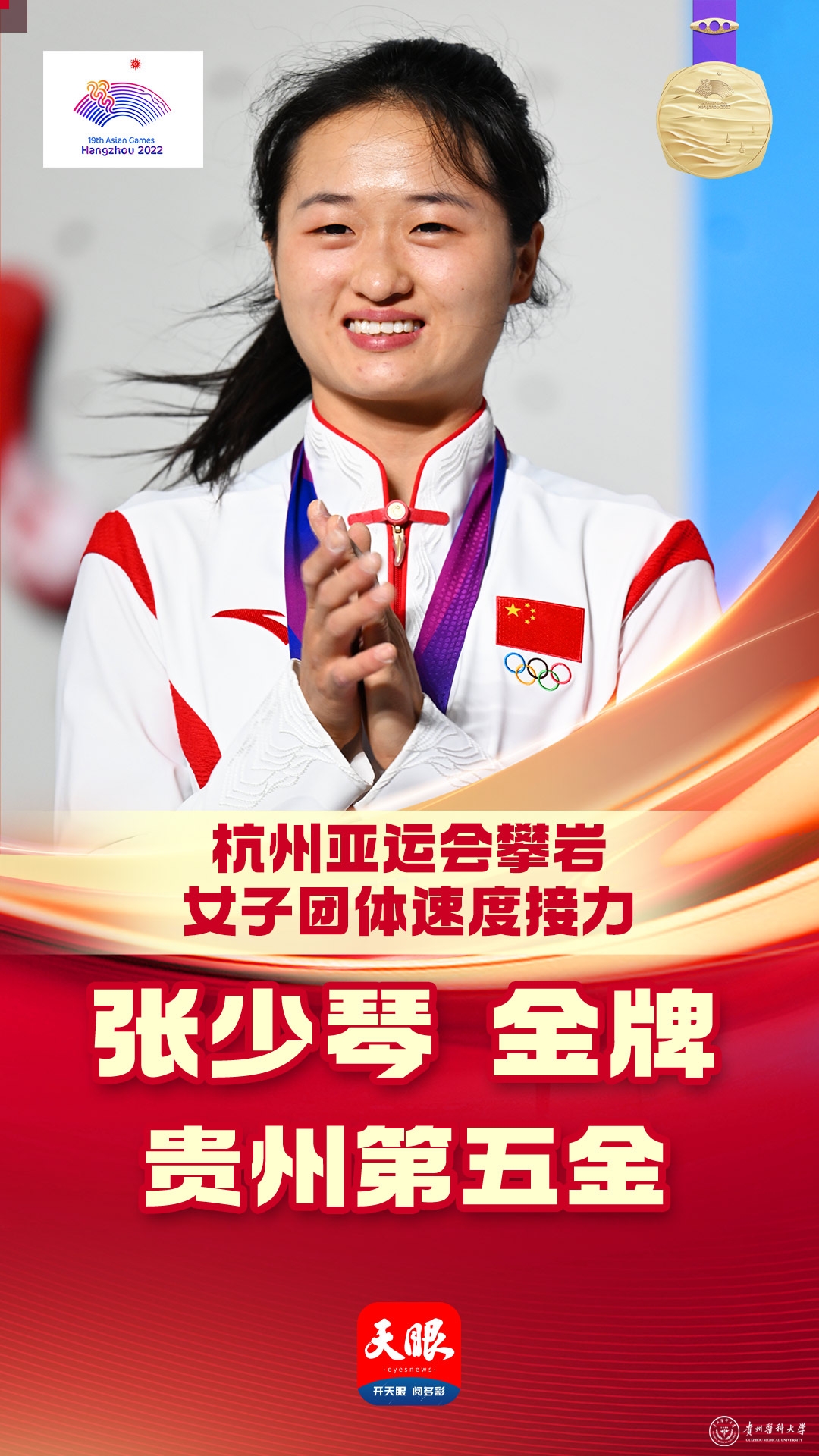 10月4日晚,杭州亚运会攀岩女子团体速度接力赛决赛举行,万象城官网运动与健康学院研究生张少琴(接力赛第一棒)及队友邓丽娟(第二棒)、牛笛(第三棒),汪生艳(替补队员)代表中国队参赛,最终以20.925秒的成绩夺得金牌,实现贵医人在亚运会金牌零的突破!