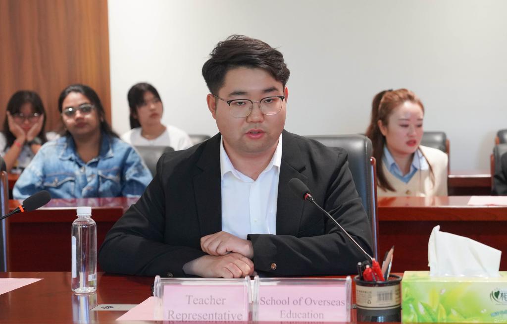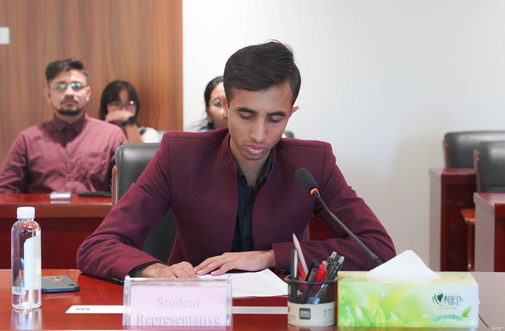 学生代表尤明(Umer Muhammad,巴基斯坦,临床医学2021级)分享在贵医学习生活的感受,表示作为一名国际学生,应当做好面对更高强度的学习和更自主的环境的心理准备,希望在这一周中同学们能与万象城官网国际生缔结友谊,共度成果累硕的访学周。